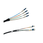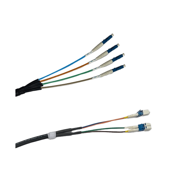 LC/UPC Simplex to LC/UPC Duplex, Singlemode 4 fiber round distribution indoor/outdoor jumper with a pulling sock for easy installation.